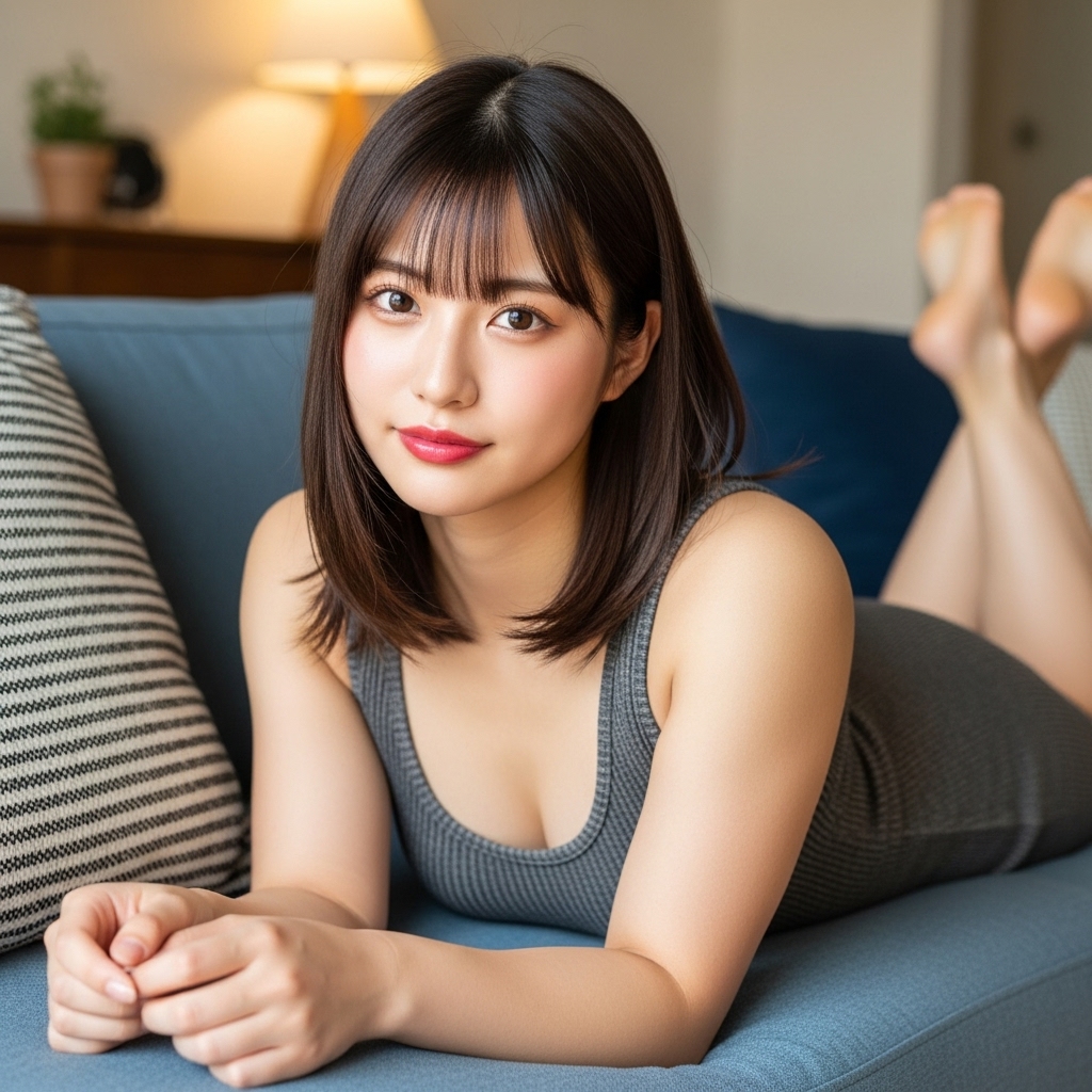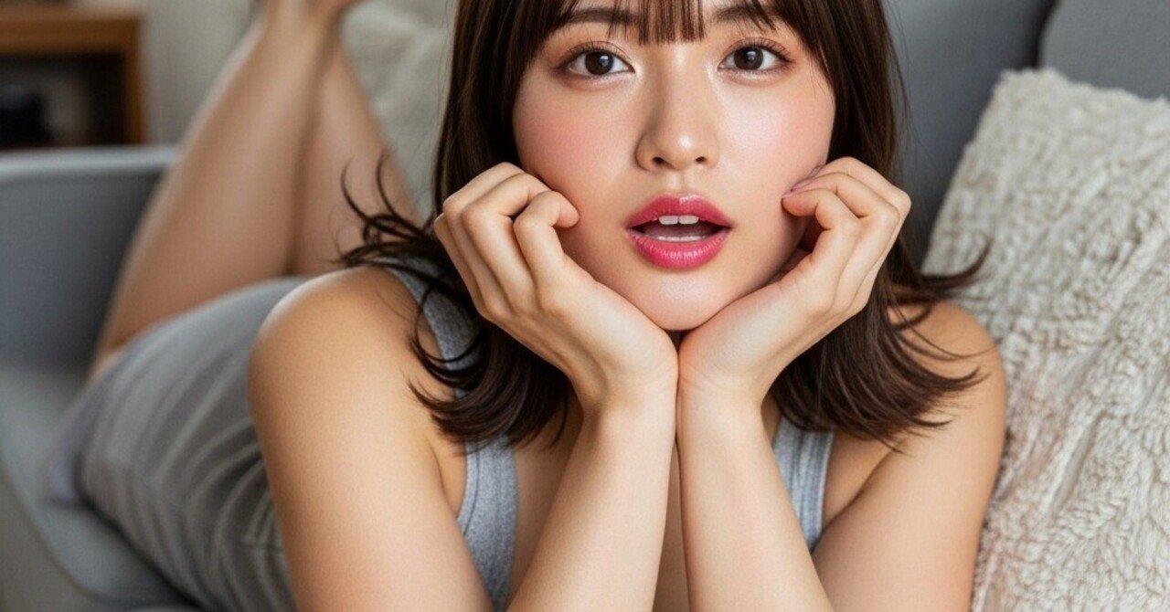 【18種類プロンプト公開】自宅のソファに寝転んであざとくて可愛い仕草をするアイドル風ルックスのAI美女の画像生成用プロンプト大公開します。ミディアムヘアのAI美人|お喋りモンスター爆顔 OSHYABAKU