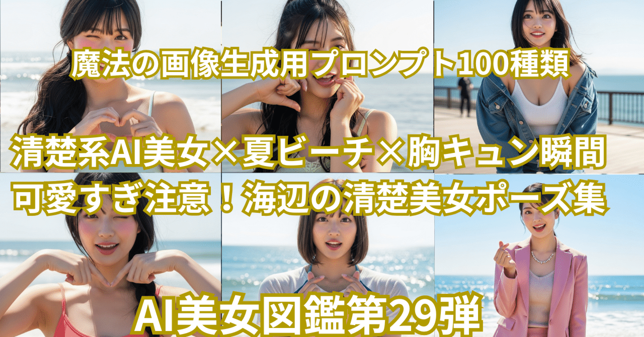 【第29弾】清楚系AI美女×夏ビーチ×胸キュン瞬間 可愛すぎ注意!海辺の清楚美女ポーズ集 画像生成用プロンプト100選大公開します 夏の海のヒロインたち|お喋りモンスター爆顔 OSHYABAKU