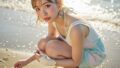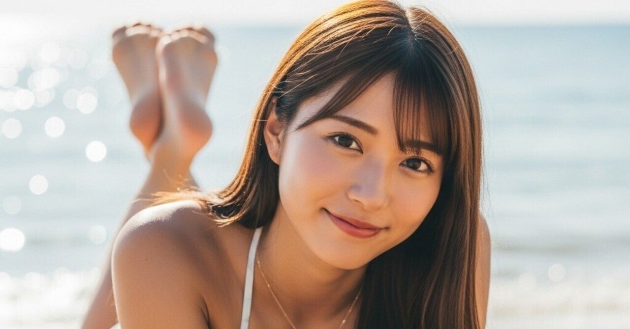 関連記事 輝く砂浜に横たわる、ひとりの日本人女性。 彼女の髪は太陽を受けて黄金にきらめき、前髪は整然と額を縁取る。 身にまとうのは、深いエメラルドグリーンのビキニ。 メタリックストラップが日差しを受けて眩しく光り、 海と空の青に溶け込むよう...